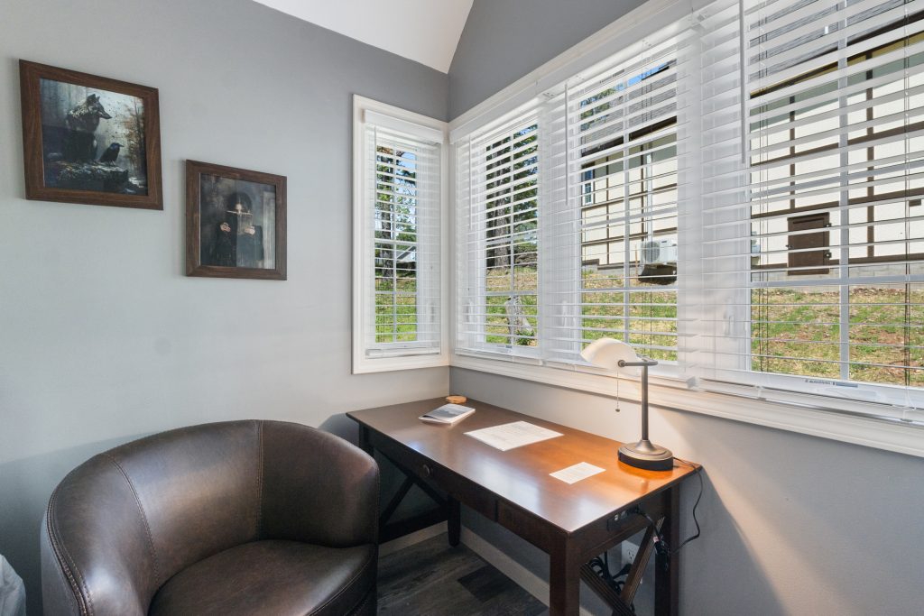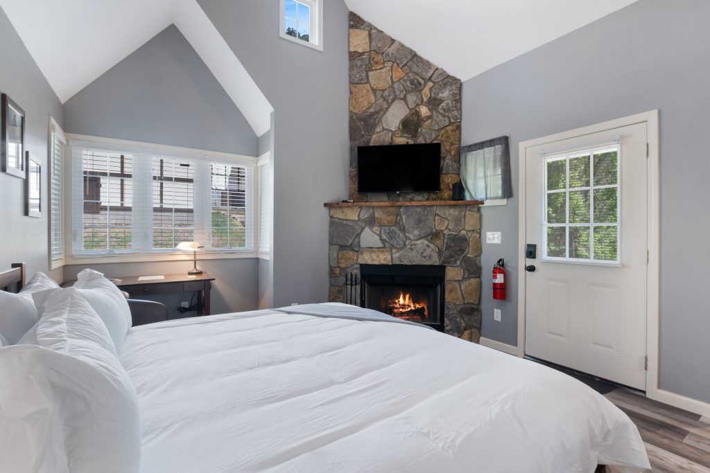Escape to a charming Tudor-style cottage for your next nightly getaway, nestled just steps from the trolley stop near vibrant downtown Eureka Springs. This studio retreat welcomes you with a plush Dream Cloud king bed, perfect for unwinding after a day of exploration. The inviting space features a comfy chair and desk, a wood-burning fireplace to set the mood, and a 43-inch TV for your entertainment.